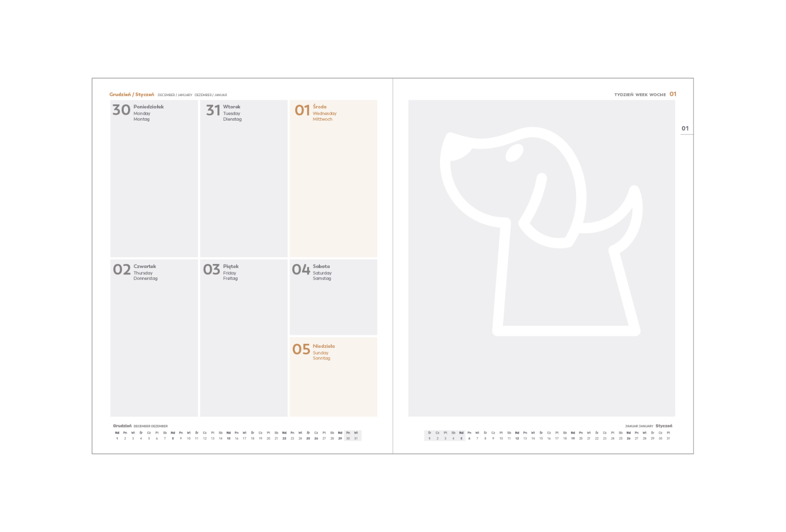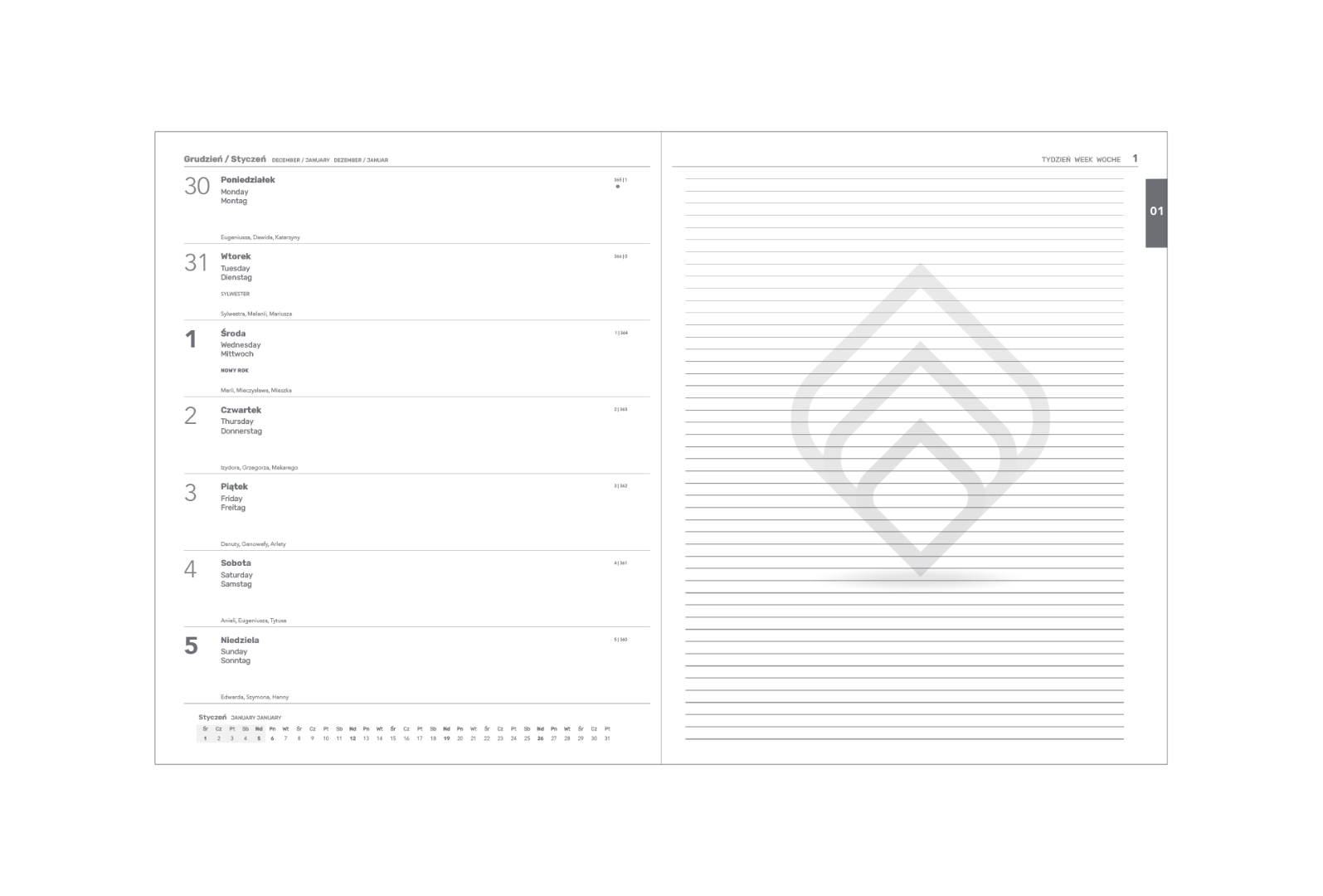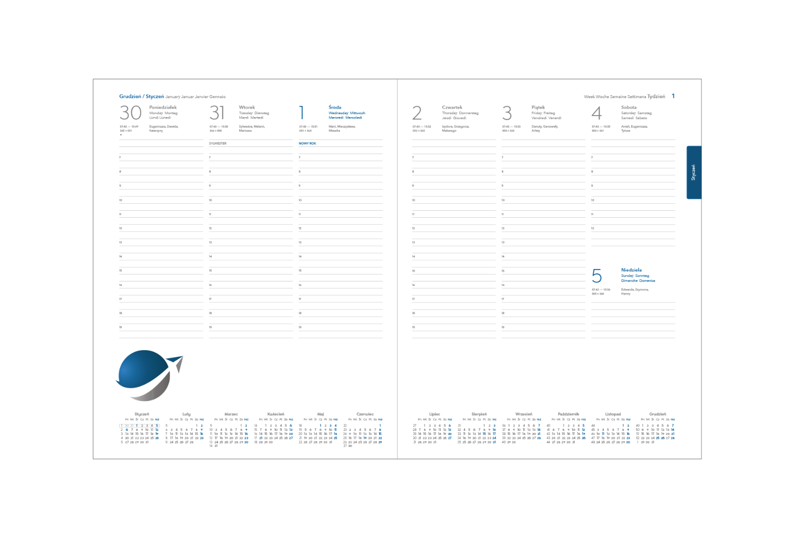 Kalendarium może zawierać spersonalizowane treści między innymi logo, hasło firmowe, reklamy produktów i usług lub być w innych wersjach językowych niż standardowe.